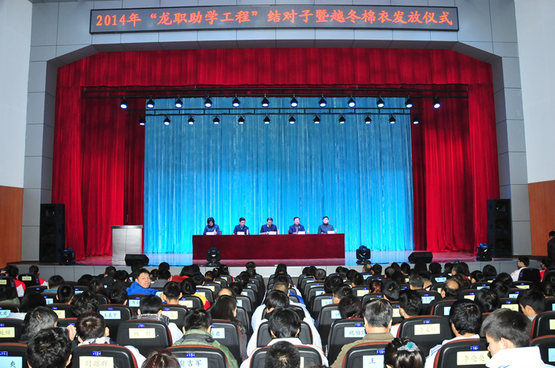 为全面贯彻落实国家各项助学政策,大力弘扬中华民族扶贫济困传统美德和友善互助核心品格,培育和践行社会主义核心价值观,使广大学生深切感受到党和政府的深情关怀,11月28日,学院在学府会堂隆重举行2014年“龙职助学工程”结对子暨越冬棉衣发放仪式。学院院长赵继会,常务副院长刘公远,副院长李贵林、郑福贵,纪委书记周莲香出席仪式。仪式由常务副院长刘公远主持。