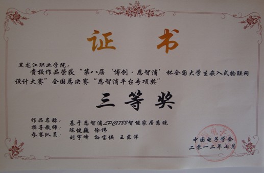 在近三个月的赛前准备中,指导教师和参赛队员克服种种困难,进行设计及调试工作。经过紧张激烈角逐,陈健巍、徐伟、王亿老师指导的刘宇峰、孔令龙和王东洋、孙宝侠、宋琳同学2支参赛队的设计作品分别获得了总决赛三等奖。通过本次大赛,提高了老师的实践教学经验,锻炼了参赛同学专业知识和技能,培养了他们的创新能力、团队精神,提升了我院物联网技术实力和知名度;同时与全国各个知名院校的参赛队进行了嵌入式技术的交流,开阔了视野。