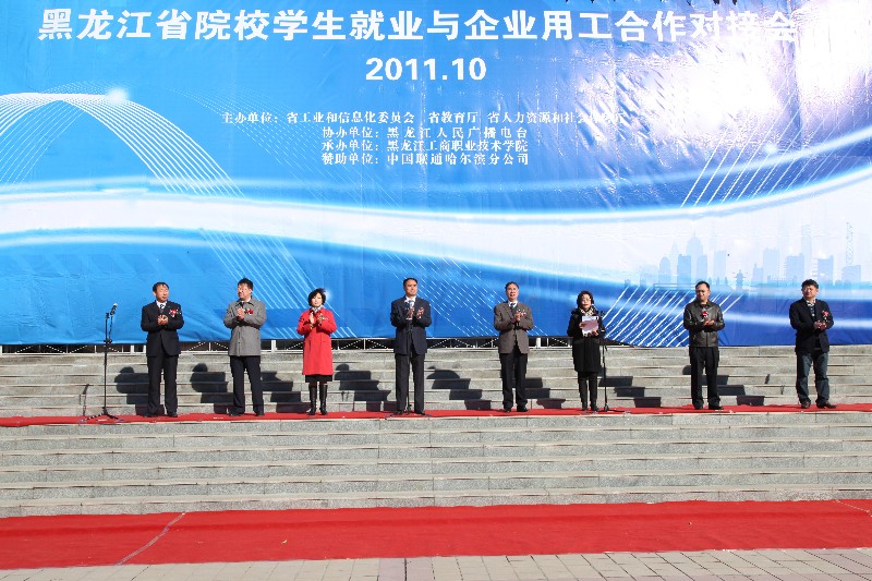 为促进高校毕业生与用人单位双向选择,搭建良好的信息交流平台,10月17日,由省工信委、省教育厅、省人力资源和社会保障厅联合主办,学院承办的2011年黑龙江省院校学生就业与企业用工合作对接会在学院运动场胜利召开。省工信委主任孙珅、省人力资源和社会保障厅副厅长黄迎新、省教育厅大学生就业指导中心主任郭承哲,黑龙江人民广播电台副台长李晈,学院党委书记冯玉龙、院长赵继会,中国联通公司黑龙江省分公司经理甘为民分别代表大会的主办、协办、承办和赞助单位出席会议。共有来自省内外217家大型骨干企业和省内92家院校代表及各高校应届毕业生参加此次会议。开幕式由省工信委纪检组长赵梅同志主持。