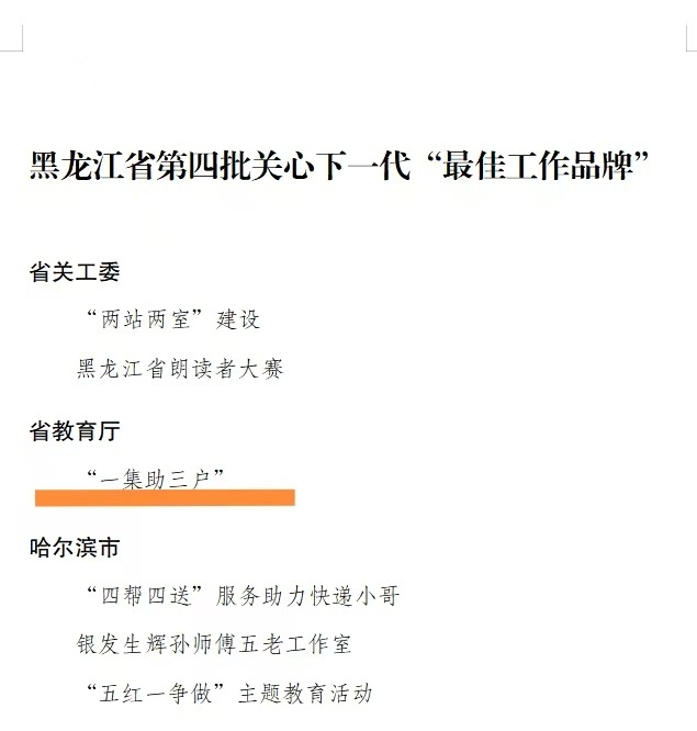 近日,黑龙江省第四批关心下一代“最佳工作品牌”评选结果公布,由省教育厅关心下一代工作委员会(以下简称“关工委”)唯一推送的,以伟德官网关工委“一集助三户”为典型案例的关工品牌,被黑龙江省关工委评为“最佳工作品牌”。