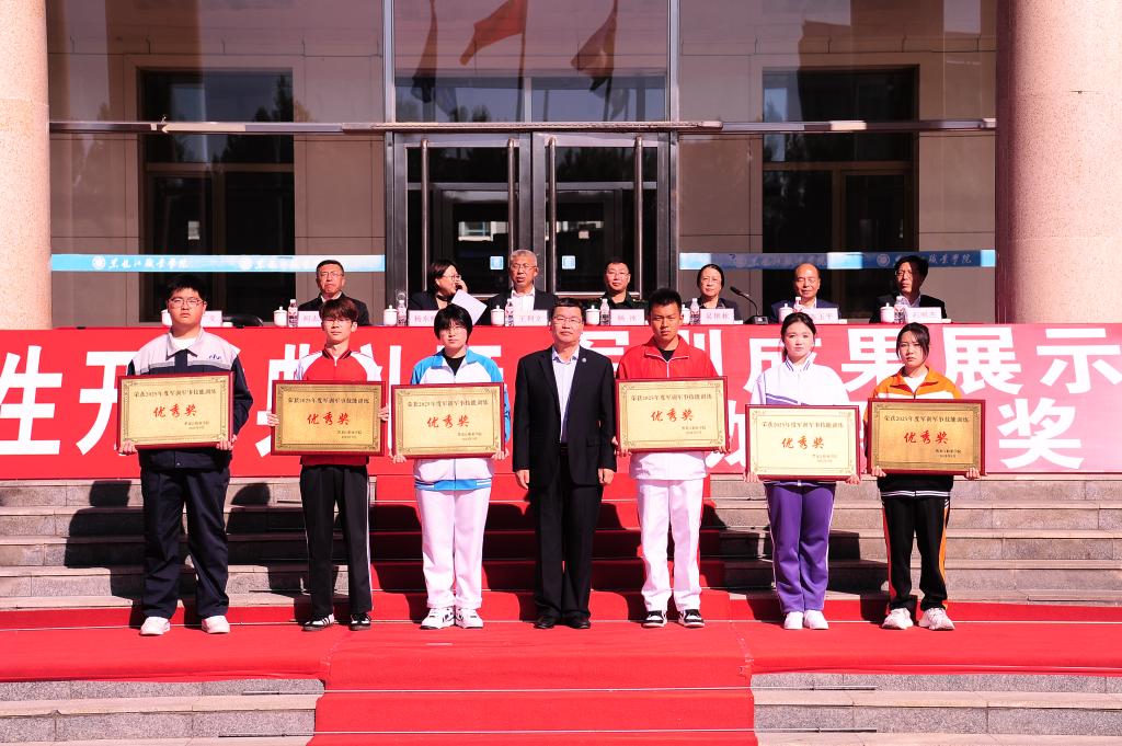 学校领导为在军训中取得优异成绩的先进集体颁奖。