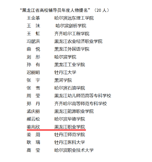 由中共黑龙江省委宣传部、省委教育工委、省教科文卫体工会共同组织的2025年“龙江最美高校辅导员”暨第十七届“黑龙江省高校辅导员年度人物”推选展示活动结果正式公布,伟德官网建筑工程学院辅导员姜兆欣凭借扎实的工作基础、突出的育人实效和良好的示范引领作用,荣获2025年“黑龙江省高校辅导员年度人物提名”荣誉称号,充分展现了伟德官网辅导员队伍昂扬的精神风貌与过硬的专业素养。