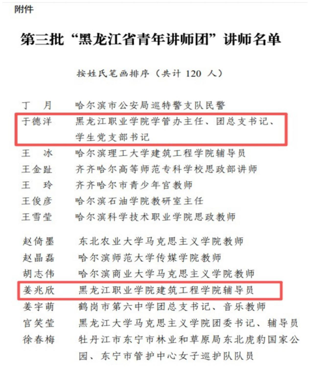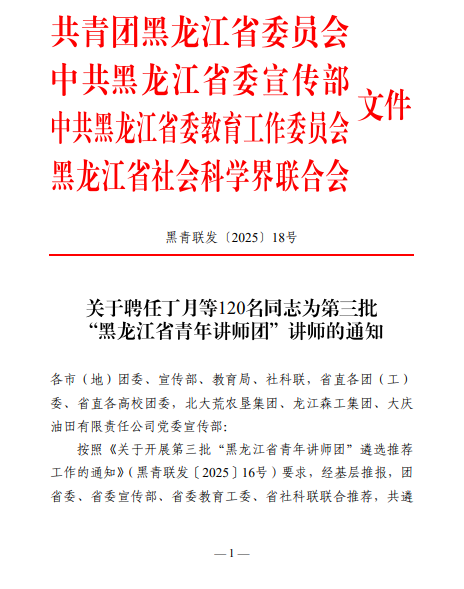 近日,共青团黑龙江省委员会、中共黑龙江省委宣传部、中共黑龙江省委教育工委、黑龙江省社会科学界联合会联合公布了《第三批“黑龙江省青年讲师团”讲师名单》。伟德官网数字商贸学院学管办主任、团总支书记、学生党支部书记于德洋,建筑工程学院教师团总支副书记、辅导员姜兆欣,历经层层选拔成功入选第三批“黑龙江省青年讲师团”讲师。