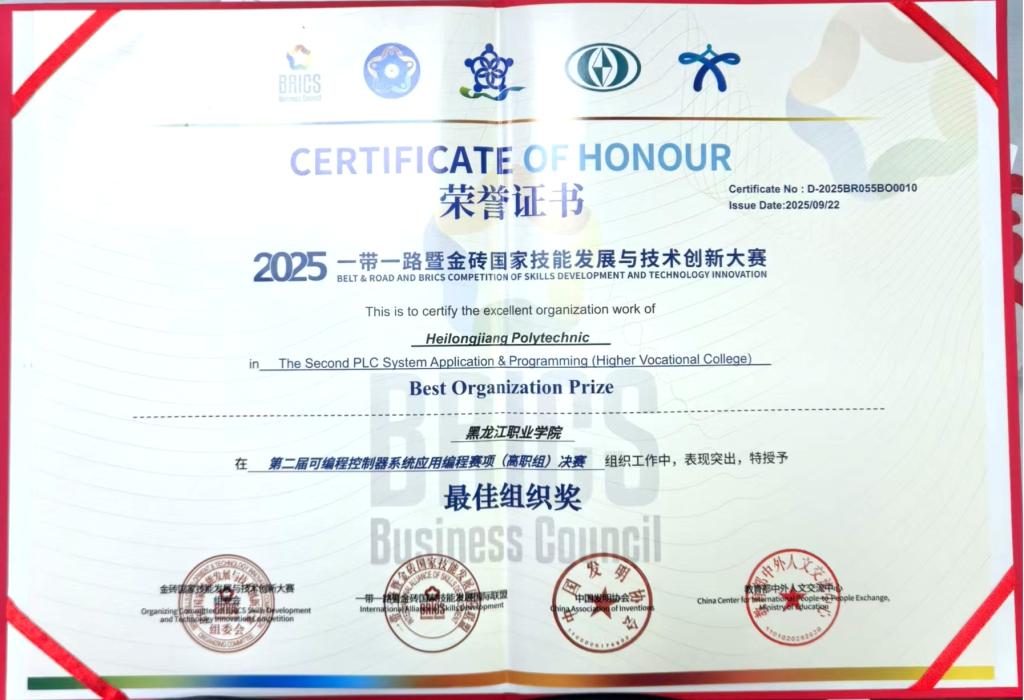 9月20日,2025年“一带一路”暨金砖国家技能发展与技术创新大赛第二届可编程控制器系统应用编程赛项在黔西南民族职业技术学院举办,来自136支高职院校队伍和41支中职院校队伍参加,通过理论和实践等环节比拼,智能制造技术学院徐伟老师指导的学生曲云辉凭借着扎实的技术功底,在众多选手中脱颖而出,全国排名第九,斩获金牌,实现伟德官网在此赛事的新突破。大赛委员会为伟德官网颁发了最佳组织奖,对伟德官网组织备赛、参赛工作给予充分肯定。