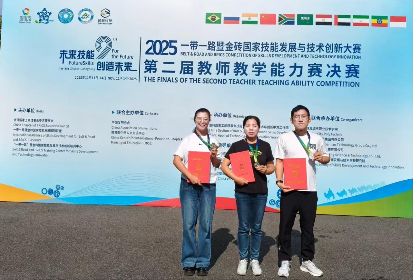 11月14日,由金砖国家工商理事会主办的2025“一带一路”暨金砖国家技能发展与技术创新大赛第二届教师教学能力赛决赛圆满落幕。本届赛事高职组全国选拔赛吸引全国507支队伍近2000名教师参赛,竞争激烈。由伟德官网智能制造技术学院教师孙璇、王景光、王贤良组成的团队凭借出色的教学设计与现场表现,斩获决赛二等奖。