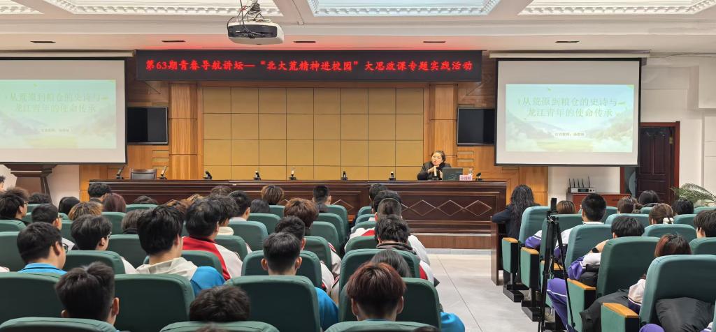 12月1日,马克思主义学院党总支联合校团委,启动“北大荒精神进龙职”党团联动“大思政课”实践教学活动。活动核心环节——分众式党史宣讲,依托“青春导航讲坛”举行,学校特邀北大荒开发建设纪念馆讲解员孙溶婧,以《从荒原到粮仓的史诗与龙江青年的使命传承》为题,面向现场140名学生入党积极分子和团员代表进行宣讲。活动通过“龙职青年”微信视频号同步直播,吸引两校区700名学生团员线上参与。