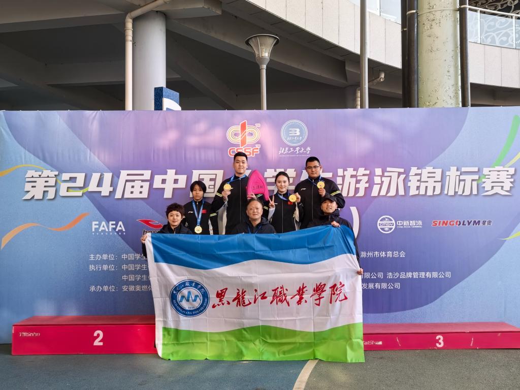 12月10日,第24届中国大学生游泳锦标赛(北方赛区)在安徽滁州圆满落幕。本次比赛汇聚了来自清华大学、北京大学、浙江大学等114所高校的700余名运动员。伟德官网派出由魏影、赵添琪、李小仙、田浚浩、李庚洋五名队员组成的代表队,在王晓倩、闫宇鹏老师的指导下奋勇拼搏,最终斩获高职组女子200米自由泳、男女4×100米自由泳接力、男女4×100米混合泳接力3枚金牌,并摘得5枚铜牌,荣膺高职组女子团体亚军及男女团体第四名,首次在全国赛中登顶两项接力项目冠军。