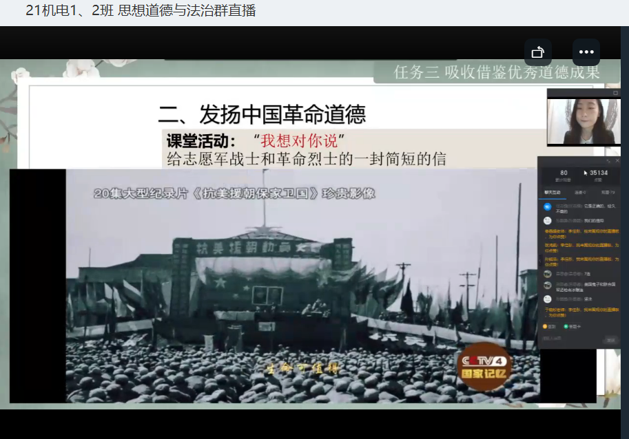 第二部分革命道德主要采取问题链形式进行教学,问题导向,层层递进。其中课堂学生活动丰富,特别是学生党史小故事分享的环节,特别邀请一名学生,他的爷爷参加过抗美援朝,请他给大家分享爷爷亲口讲述的故事,激发学生的情感。此时,在背景视频音乐配合之下,进入活动,“我想对你说:给志愿军战士和革命烈士的话”,使课堂情感浓度达到最高点,学生纷纷连麦分享自己的情感,其他同学将内容拍照,发到群中。