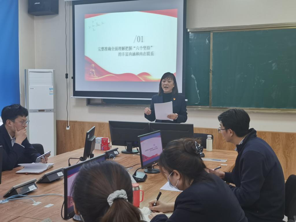 刘莉副院长在党课最后希望全体教师要学思践悟“六个坚持”,进一步深化真理认知,进一步深入学习贯彻习近平新时代中国特色社会主义思想对马克思主义的原创性贡献,更好观察时代、把握时代、引领时代,不断开辟马克思主义中国化时代化新境界。
