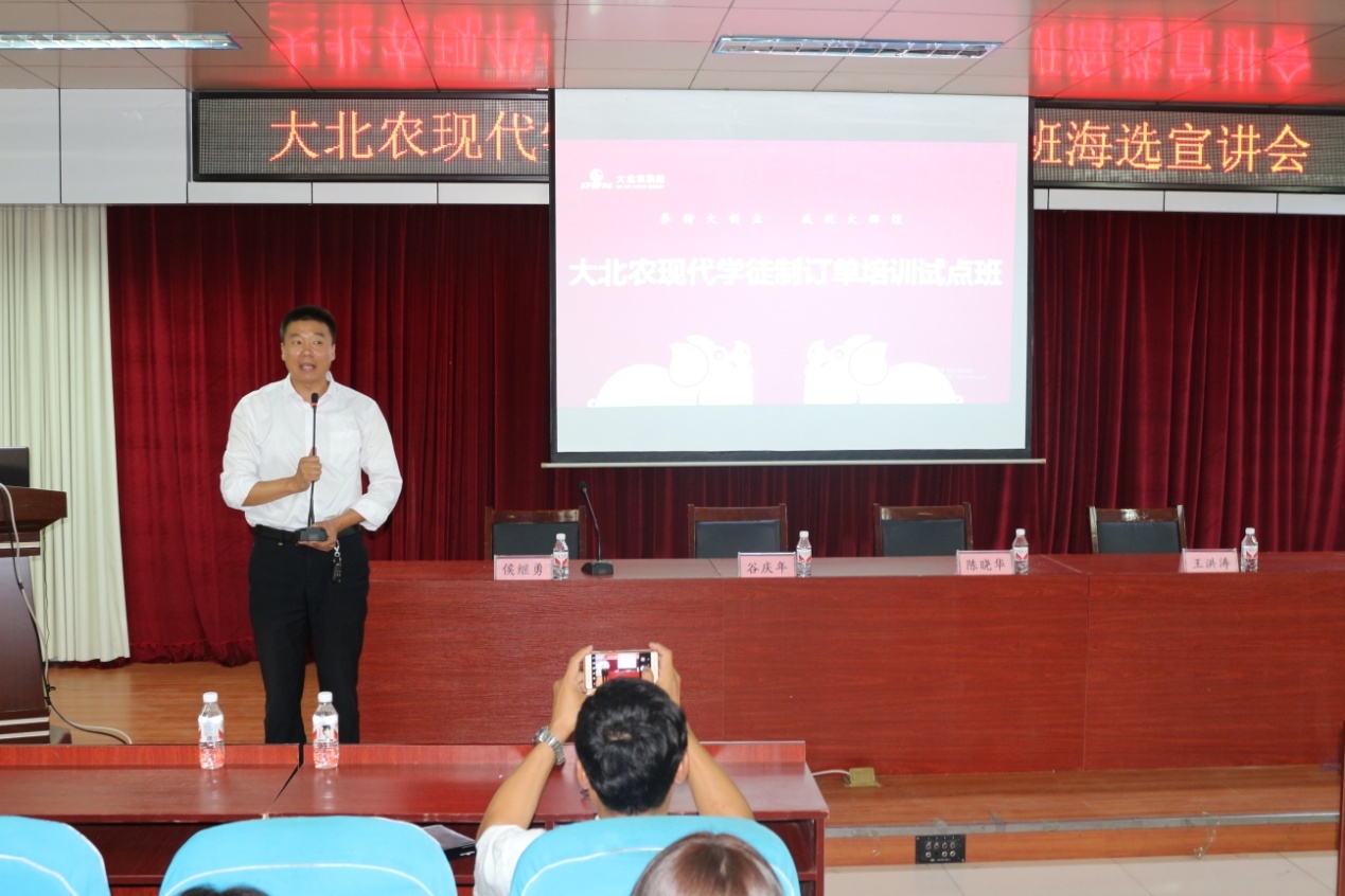 18:00,在2号教学楼6楼会议室由侯继勇书记主持召开了“大北农现代学徒制订单培训试点班海选宣讲会”。由陈晓华院长向2017级畜牧兽医专业新生介绍了我院和大北农集团的合作历史及“大北农订单班”的合作模式。谷庆年总监向新生介绍了大北农集团的基本情况和在全国多地现代化猪场的建设情况,并表示到2020年目标出栏量将达到6000万头,畜牧兽医人才紧缺。集团承诺“大北农班“学生就是企业的“准员工”和“后备干部”,通过校企双方共同培养,将缩短学生在企业的“管培期”,学生能早日挣得人生“第一桶金”。集团还在“大北农班”设立“奖学金”用以奖励品学兼优的学生,同时集团承诺“大北农班”学生拥有就业自主选择权。会上,现就职于大北农集团的我院2017届畜牧兽医专业优秀毕业生高冬雪和今年暑期在大北农所属黑龙江天佑猪场拥有一个月实习经历的大三学生赵卫光同学,分别分享了在大北农集团的工作和实习感受。会议结束后,有意愿的同学自愿申请报名,经企业负责人面试筛选,最终确定29名学生为“大北农订单班”成员。